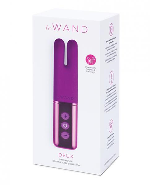 Hailed as one of the most innovative sex toys, the Le Wand Deux is a palm-sized, external mini vibe that surrounds, snuggles, and satisfies any pleasure zone that craves powerful stimulation.The Le Wand Deux features twin motors that give the rechargeable mini vibe its bunny-eared look. Although humble in size and sound, the Deux boasts an almighty 15 vibration modes and 6 intensity levels to test your or your partner's skill to resist orgasmic satisfaction!Made from velvety soft silicone that's 100% body-safe, the Le Wand Deux is renowned for its "sensation in stereo" ability to magnify pleasure when it hones in on the clitoris and nipples. Add a dollop of warming lube on the Deux's ears for some delectable temperature play.Every Deux purchase comes with a micro-suede travel pouch for discreet storage or some sensual fun on the go.Materials: Body-Safe Metal & SiliconeSize: 27 (L) x 116 (H) x 13 (D) mmWeight: 0.19 lbs / 87 gUSB rechargeable. Charging Time: 1.5 hoursUse Time: 1 hourInterface: 3 buttonsIntensity Levels: 6Vibration Modes: 15