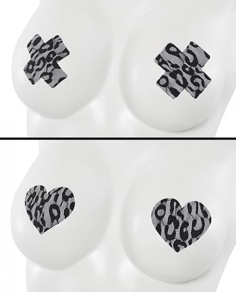 Cross and heart shaped flat pasties. Leopard lace fabric.Set includes 1 Pair in each shape.One time use.Black 2 Pairs (1 Cross & 1 Heart)Leopard Print Mesh.