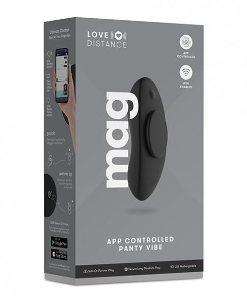 The Love Distance Mag Panty Vibrator is an app controlled panty vibrator. This long distance vibrator offers 20 powerful vibrating functions with 12 speeds. The vibe is made from body safe silicone and can be used independently of the app. It has a magnet that secures the vibe for hands free stimulation. Panty not included.USB rechargeable.Compatible with the Love Distance App (Private, fully encrypted and secure. Android users must download the app from the Love Distance website )Don't pair the Love Distance item from your device's setting screen. The item must be paired from within the Love Distance app itself.Waterproof.