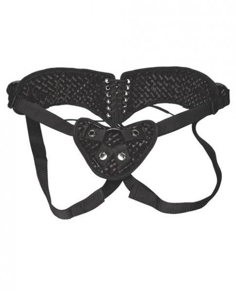Give your partner the pleasure they want and deserve with the Lux Fetish Diamond Velvet Strap-On Corset. This beautiful harness is made of a comfortable, secure velvet material, and features 4 way adjustable straps that fit hips up to 60 inches, and a perfectly placed bullet vibe pocket for endless clitoral stimulation. <br /><br />This strap-on can accommodate any dildo with a flared base, and includes 2 rubber holder rings. Perfect for the woman or man that wants to add a bit of luxury to their bedroom play, the Lux Fetish Diamond Velvet Strap-On Corset pairs decadent velvet with gorgeous details in the design. The back of the corset laces up to ensure the perfect fit while looking as erotically chic as your favorite piece of lingerie. The Velvet Strap-On Corset features a four way strap system that fits a variety of sizes. Color Black. Size one size fits most.