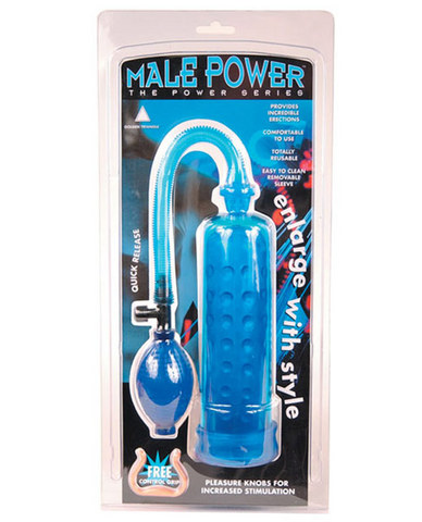 Enlarge in style with the Male Power Pump blue penis enlarger pump. The soft jelly sleeve is equipped with nubs for stimulation while you pump your way to a huge erection. Comes with a penis grip so you can keep it up as long as you need to. Proven to increase your sexual confidence – feel good and look good!