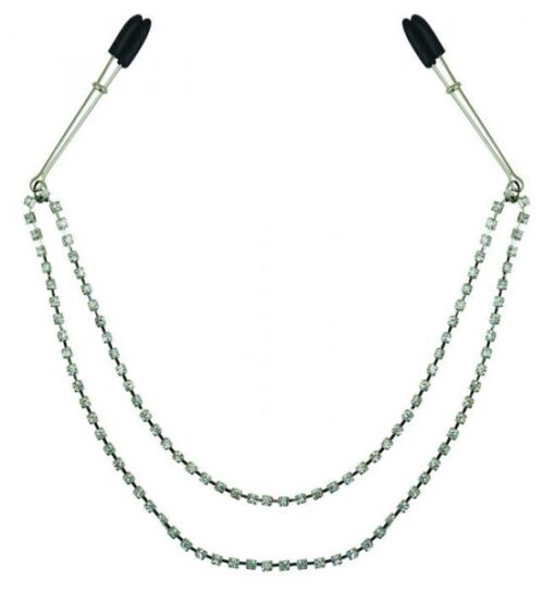 This 20 inches doubled strand of sparkling bling will give you a formal feeling while the rubber tipped nipple clips serve as a constant reminder that all are entitled to feeling a little pain with their pleasure. From Midnight by Sportsheets.