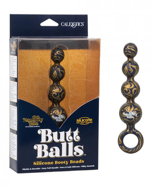 The Naughty Bits Butt Balls Silicone Booty Beads is made for all your anal needs with a plush silicone, tapered beads and easy retrieval loop. The petite plug has a sturdy o-shaped retrieval loop for comfortable insertion, thrilling stimulation and safe, gentle removal. Perfect for beginners and erotic experts alike, the tapered shaft increases in girth for intensifying pleasure.The Naughty Bits collection is made to stand out in any nightstand with eye-catching designs and orgasmic features. The ultra plush silicone and golden marbled pattern of this gorgeous anal probe will make even the most stylish lover smiling before and after.One Year Warranty.