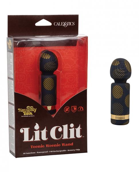 Keep it lit with the Lit Clit Teenie Weenie Wand! This easy-to-operate mini wand is ready to get down and dirty wherever your passions take you with 10 functions of vibration, flexible neck and compact design.The mini wand massager fits between your fingers to let you deliver pinpoint tantalization and thrill with flexible vibrations. Get playful with 10 indulgent vibration, pulsation and escalation functions with the easy-touch control button.The ultra-plush silicone and wide flexible head are great for exploring sensual sweet spots and intimate pleasure points with ease. Take your pleasure to-go with the travel lock feature by holding down the power button for 3 seconds to turn on/off.The Naughty Bits collection is made to stand out in any nightstand with eye-catching designs and orgasmic features. The ultra plush silicone and sleek gold details of this gorgeous mini massager will make even the most stylish lover smiling before and after.One Year Warranty.