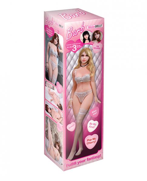 The worlds most popular doll is now lifesize with all the right parts! And she is all yours to play with whenever and however you want… Thanks to cutting-edge developments in material and design, you can experience a pleasure doll that looks and feels more lifelike than ever before. This classic beauty is fully-posable, from her eyelids to her feet, so you can enjoy her ultra-realistic mouth, vagina, or anus in any position you desire. She can even stand up on her own!Her perfect C-cup breasts will feel soft in your hands, jiggling as you thrust hard into any of her 3 tight, textured holes. Guide her with a firm hand in her long hair, fondle her adorable nipples, and squeeze her perky ass. Dress her up in something cute or slutty, and then have even more fun undressing her! You can touch, you can play, you can say she is always yours!Use with only water-based lubricants. Wipe down surface and clean out orifices before and after use with mild soap and warm water or a toy cleaner. Keep dry and powdered when not in use. Do not store items on top of doll. Please store all clothing and accessories separately from the doll as the dolls material can absorb pigment.Measurements: Barb is 63 inches tall, with a 30 inch chest, 20 inch waist, and 32 inch hips. Her vaginal and anal depths are 7.5 inches and her oral depth is 6 inches. Her shoe size is 8.5.Note: Includes doll, a soft blanket, babydoll and G-string lingerie, and 3 wigs: blonde, brunette, and black.