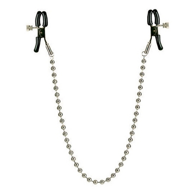 Totally adjustable, comfortable, non-tarnishing, rubber coated nipple clamps Steel chain. ABS plastic beads, PVC tips. 16 inches chain. 2 inches length nipple clamp.