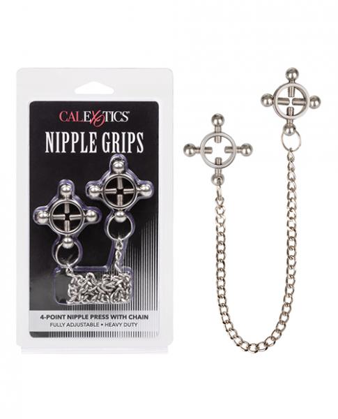 Push sensation to the next level and enjoy teasing nipple play with the Nipple Grips 4-Point Nipple Press with Chain. Explore elevated sensation with the 2 fully adjustable multi use clamps, screw down 4-point press, and teasing chain. Reach new levels of playful pleasure in the screw-down 4-point press with fully adjustable screws. Clamp the naughty clasps to the nipple or anywhere on the body and enjoy every rush of pain and pleasure.The teasing clamp has fully adjustable 4 points of tension to stimulate anywhere on your body for playful teasing. As the tension tightens, the tingles intensify with every turn of the screw for the ultimate in nipple stimulation toys. With the teasing clamp stimulation and increased blood circulation, you can look forward to amplifying overall arousal with every brush of the teasing chain. These easy-to-use nipple teasers are great for him or her.Materials: Stainless Steel.Features:Fully Adjustable multi-use clamps.Screw down 4-point press with fully adjustable screws.Chain for added sensuality.Non-tarnishing, nickel free.Heavy Duty Metal.Dimensions:Overall Length – 20.5 inches.Fully extended inner diameter – .75 inch x .75 inch. One Year Warranty.