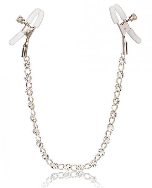 Push sensation to the next level and enjoy teasing nipple play with the Nipple Play Crystal Chain Nipple Clamps. Explore elevated sensation with the 2 fully adjustable nipple clamps, teasing chain and sparkling crystals. Reach new levels of playful pleasure with the adjustable clamps. Clamp the naughty clasps to your body and enjoy every rush of pain and pleasure. The teasing clamp has adjustable tension to stimulate anywhere on your body for playful teasing. <br /><br />As the tension tightens, the tingles intensify with every turn of the dial for the ultimate in nipple stimulation toys. With the teasing clamp stimulation and increased blood circulation, you can look forward to amplifying nipple sensitivity and intensify overall arousal. These easy to use nipple teasers are great for him or her. <br /><br />The two adjustable clamps are made from nickel free iron with silicone cote, and nickel free iron chain and Silica crystals. Measurements 12 inches chain, 2.25 inches each nipple clamp.