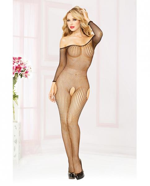 Seamless Fishnet Long Sleeve Off the Shoulder Open Crotch Bodystocking from Seven Til Midnight lingerie line. Color Black. One size fits most. Sizes 2 to 12. Cups A to D. Bust 32 inches to 38 inches. Waist 24 inches to 32 inches. Hips 34 inches to 40 inches.