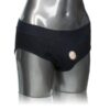 Discreet 2 panel design to accommodate dual penetration. Reinforced O-ring stretches to accommodate most packers, dongs or probes. Soft, stretchy and comfortable. Comfortable soft lining. Internal strap to secure your packer in place. Packer not included. Internal pockets to add a favorite stimulator, not included. Washable. 95% Cotton, 5% Spandex. Please note shown with packer and dildo, not included.