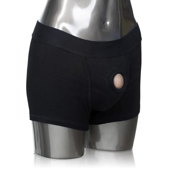 Discreet 2 panel design to accommodate dual penetration. Reinforced O-ring stretches to accommodate most packers, dongs or probes. Soft, stretchy and comfortable. Comfortable soft lining. Internal strap to secure your packer in place. Packer not included. Internal pockets to add a favorite stimulator, not included. Washable. 95% Cotton, 5% Spandex. Please note shown with packer and dildo, not included.