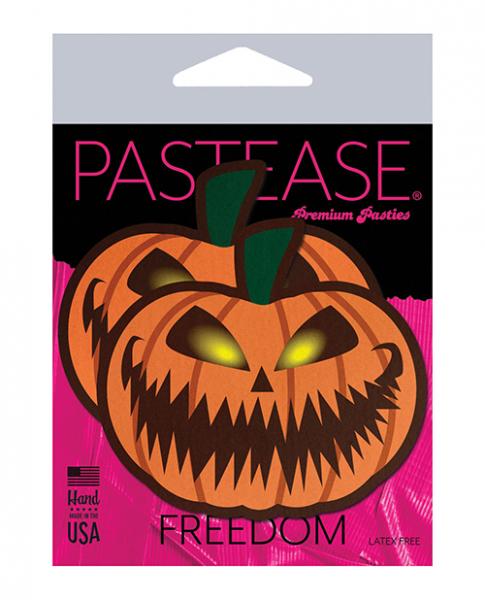 Pumpkin: Terrifying Halloween Jack O' Lantern Pumpkin Pasties by Pastease® are hand-made of soft form-fitting material that forms seamlessly to curves and resists wrinkling over hardening nipples.Just peel-and-stick these breast pasties on clean, dry skin. All Pastease® feature latex-free, medical-grade, waterproof adhesive that stay securely in place for as long as you like and until they are gently removed.Conceal or Reveal with Pastease® nipple pasties when worn with a sexy outfit, daring bikini, sheer top, revealing dress, Hefty bag, body lotion, crazy costume, party theme or nothing at all!Dimensions: 3 X 2.8 inches.Coverage: 2.8 inches.