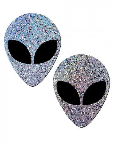 Pastease Silver Glitter Alien with Spacey Black Eyes Nipple Pasties by Pastease are hand made in the USA of soft form fitting glittery material that forms to curves and resists wrinkling over hardening nipples. Just peel and stick on clean, dry skin. <br /><br />All Pastease feature latex free, medical grade, waterproof adhesive that stay securely in place for as long as you like and until they are gently removed. Conceal or reveal with Pastease nipple pasties when worn with a sexy outfit, daring bikini, sheer top, revealing dress, Hefty bag, body lotion, crazy costume, party theme or nothing at all! Fear not humans, she comes in peace! <br /><br />Dimensions: 2.4 inches by 3.1 inches. Coverage diameter 2.4 inches. Pastease are the fun maker that brings out your inner Tease!