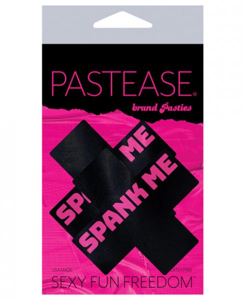 Plus X: Liquid Black Cross with Pink 'Spank Me' Nipple Pasties by Pastease® are hand-made in the USA of soft form-fitting material that forms seamlessly to curves and resists wrinkling over hardening nipples.Just peel-and-stick on clean, dry skin. All Pastease® feature latex-free, medical-grade, waterproof adhesive that stay securely in place for as long as you like and until they are gently removed.Conceal or Reveal with Pastease® nipple pasties when worn with a sexy outfit, daring bikini, sheer top, revealing dress, Hefty bag, body lotion, crazy costume, party theme or nothing at all!Dimensions: 3 X 3 inchesCoverage Diameter: 1.6 inches