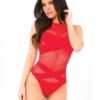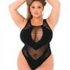 Fishnet Body suit with criss cross detail in all the right places. Fabric content 92% Nylon 8% Spandex. Color Black. One size fits most. Bust 31 inches to 37 inches. Waist 23 inches to 29 inches. Hips 33 inches to 39 inches. Cups B/C. Dress sizes 4 to 12.