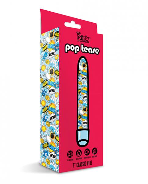 Pop Tease. Happily Ever After! 10 function vibes for the perfect fairy tale ending! Zero waste packaging because saving the planet is a real turn on. Every part of the packaging is reusable or recyclable and includes an eco-friendly sex toy storage bag. Classic smooth vibrator with vibrant fun and unique print. 10 powerful functions. Silicone inlaid ez push button. Illuminated LED control. Body safe. Waterproof and whisper quiet.
