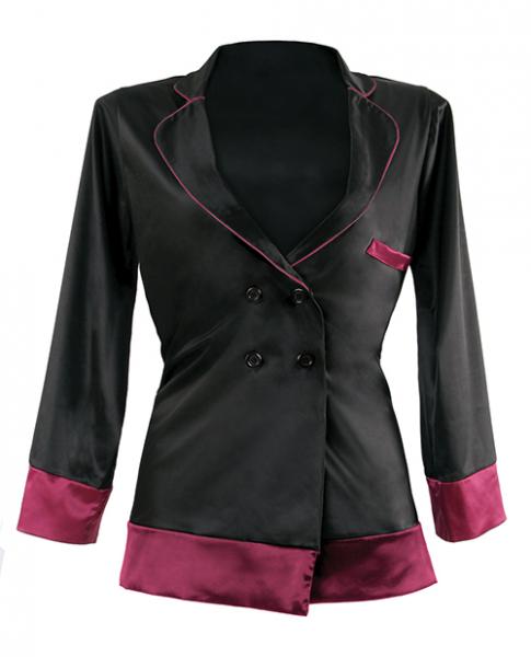 Being wrapped up in this double breasted dream redefines transcendence. Smooth black satin with contrast berry tone accents a tailored silhouette. Double breasted button closure and sexy hem allows you to show as much or as little as your sweet little dreams desire. <br /><br />Fabric content 95% Polyester, 5% Spandex. Washing instructions hand wash separately in cold water. Do not bleach. Flat dry. Ladies sizes small to medium, S/M. Sizes 2 to 6. Bust 32 inches to 36 inches. Hips 33 inches to 38 inches.