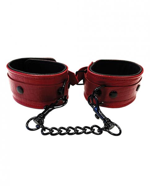 Plain Leather Wrist Cuffs with fully adjustable buckle straps in Burgundy Snake Print and Black Hardware and Accents.