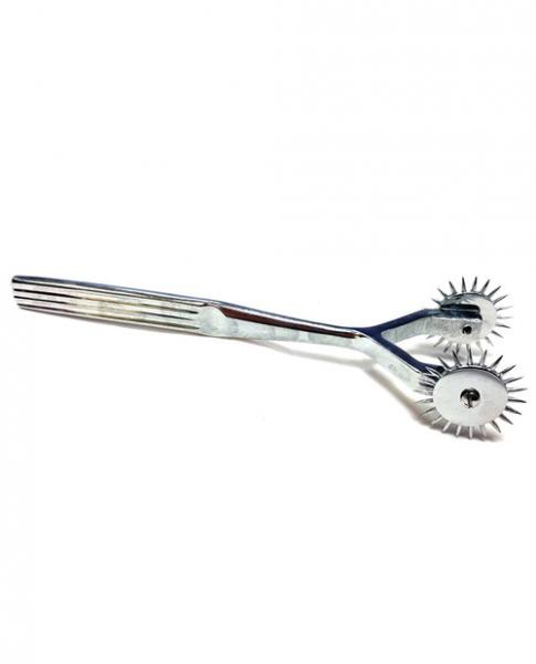 A great medical device used for sensory stimulation, pain, pleasure play, and/or teasing. Contains two spinning pinwheel heads, one on each prong. Material Nickel Plated Stainless Steel.
