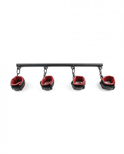 Act out your naughtiest power play fantasies with the Saffron Spreader Bar and Cuff Set.Four faux leather, lightly padded adjustable cuffs in the signature red and black of the Saffron collection buckle comfortably around your wrists and ankles and clip to the spreader bar and each other in any way you can dream up. The strong, solid spreader bar's rings are firmly welded in place, so there's no escape…only release.Imagine your ankles cuffed to the farthest ends of the spreader bar, leaving your most luscious bits on display and accessible for your lover's wicked pleasure, or your arms spread and immobilized while they tease and torment every inch of you. The spreader bar's four attachment points and the swivel snap clips on each cuff even make hog-tying or multiple partner play possible. Mix and match with other Saffron collection products for even more forbidden fun!About the Saffron collection:Saffron is a thoughtfully-crafted line of couples-friendly vegan products designed for players at every level of interest and experience. Created with beauty, comfort, and safety in mind, Saffron is perfect for anyone who desires to explore a new kind of give and take in the bedroom.Adjustable Cuffs Fit Most Users.Swivel Snap Clips Make Any Position Possible.Vegan/Vegetarian-Friendly Faux Leather.Nickel-Free Metal.Limited Lifetime Warranty.Materials: Stainless Steel, PU, Aluminum.Includes:One Spreader Bar with O-Rings in Matte Black 24.75" (62.87cm).Four Adjustable Faux Leather Cuffs in Saffron and Black 10" (25.4cm).