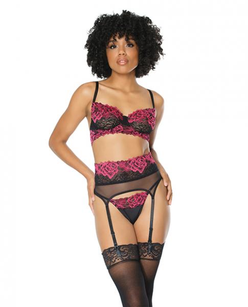 Scallop Stretch Lace and Sheer Nylon Bra, Garter Belt and G-String.Soft underwire cup. Two-tone lace details. Back hook & eye closures. Adjustable straps.Attached adjustable garters and Adjustable G-string.Scallop Stretch Lace/Sheer Nylon/Microfiber. XLarge. Weight: 180lb – 210lb. Bust: 40in. – 44in. Waist: 32in. – 36in. Hip: 42in. – 46in. Cup: C/D. Dress: 16-18.
