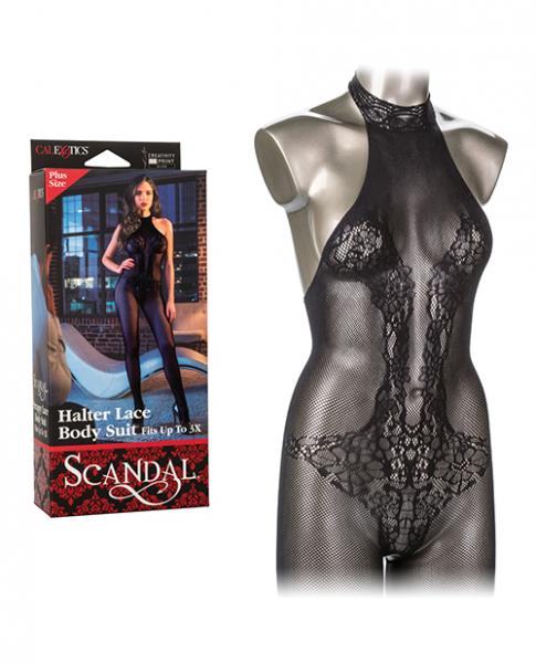 Watch your lover melt at the sight of you in the Scandal® Plus Size Halter Lace Bodysuit. This lustful full-length bodysuit features a flattering lace design, bold crotchless detail and soft stretchy lace. Surrender yourself to your partner's every whim and indulge in unrestricted pleasure with the sinfully crotchless design. Give into primal desire, inspire new passions and indulge in scandalous pleasure with this seductive full-body ensemble. Hand wash in cool water with mild soap after each use. The stretchy lace is made from a high quality blend of nylon and spandex and fits sizes up to 3X.Materials: Nylon, Spandex.One Year Warranty.