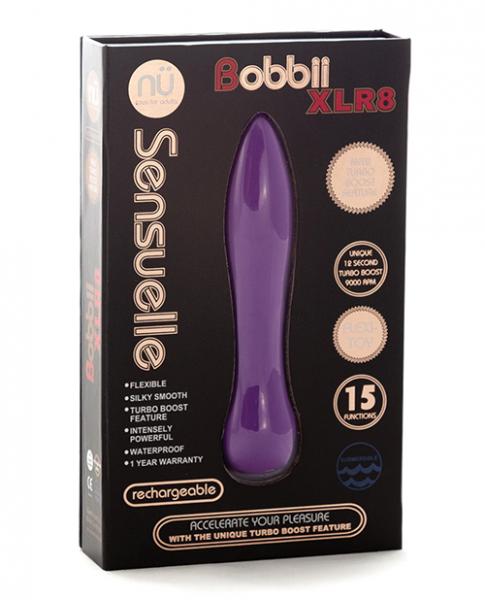 Sensuelle Bobbii XLR8 Purple Vibrator. Accelerate your pleasure with the unique turbo boost. Unique 12 second turbo boost. USB Rechargeable vibrator features 15 functions of deep throbbing and pulsating action. Plus pulsating action. Plus this power packed bullet is also flexible so you can adjust it to your unique shape. Ultra smooth, silky, sensual touch in a flexible design. Waterproof. 1 year warranty.