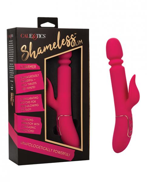 The power of a sex machine in the palm of your hand – now that's Shameless! This luxury massager is unapologetically powerful with up to 850 thrusts per minute and a vibrating teaser that will blow your mind. With a sexy, slim shaft; this sensational vibe has it all.There is no shame in this game! Experience all the thrusting pleasure you crave with this Charmer. It features 4 functions of vigorous up-and-down motion and is made with body-safe silicone that feels amazing on the skin. Not only does this massager thrust, it also vibrates with 7 different functions to choose from. The teaser flickers to hit all your hot spots. Plus, the thruster and vibrator are controlled independent, so you can customize the fun any way you like it.Shameless is extremely powerful, but it's also amazingly quiet. The powerful massager thrusts and vibrates but, it is so quiet no one will know you're having the best orgasm of your life.This massager is also easy to use. It's USB rechargeable, and includes a charging cord, so no need to fuss with batteries. It features a convenient travel lock, allowing you to travel without worry. Plus, this powerful thrusting vibe is waterproof making cleaning easy.USB Rechargeable (Included).Max Run Time :80 minutes.Max Charging Time: 120 minutes.Measurements9" x 2.25" / 22.75cm x 5.75cm (Overall).5" x 1.25" / 12.75cm x 3.25cm (Shaft).2" x 1" / 5cm x 2.5cm (Stimulator)./ 0cm ( Circumference).90 Day Warranty.