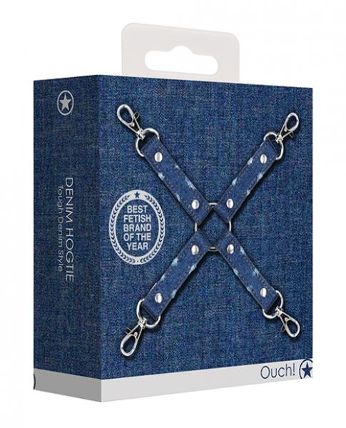 <p>Combine your favorite wrist and ankle cuffs with this 4-WAY Denim Hogtie Cross. Full body restraint has never been so easy, just clip your sub's arms and legs behind their back, or in front, for total control and submission! This Denim Hogtie will look absolutely amazing in any BDSM, beginners, as well as advanced players, collection! The sturdy O-ring connects to four heavy-duty denim straps, each with a stainless steel, quick release clasp. Just clip them onto (Ouch) hand and ankle cuffs and you're ready to play. This sturdy fabric will seamlessly blend in with anything you wear during your kinky role play! The popular world of Ouch! Denim will keep your sub secure while looking fiercely fabulous! The total maximum length of the hogtie is 25cm (9.85"). Each single strap measures 8cm (3.15").</p>