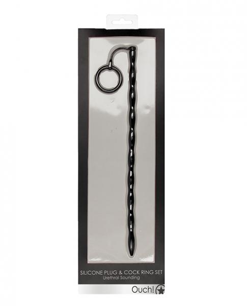 Shots Ouch Urethral Sounding Silicone Plug & Cock Ring Set – Black