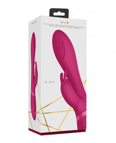 The MIRA, multi function, silicone G-spot rabbit, boasts a 10 function G-spot tip stimulator packed with spinning beads, plus a 10 function vibrating G-spot tip and a 10 function dedicated clitoral vibrator, making it a force to be reckoned with! The 3 motors give you over 1,000 possible unique settings to play with making the MIRA a powerhouse of fun. Made from 100% silky smooth medical-grade silicone, it's 100% waterproof (ipx7), and extremely quiet at under 60db, which means no-one needs to know your business. It contains a usb magnetic rechargeable lithium-ion battery, that when fully charged with its usb cable, will provide 50 minutes of passionate playtime. Just plug and charge! When you're getting close to climax, just one-touch of the special function climax button will immediately bring all the motors to full power/speed and, more importantly, bring you to an earth-shattering orgasm. Product dimensions: 8.46" x 1.65" x 2.32".