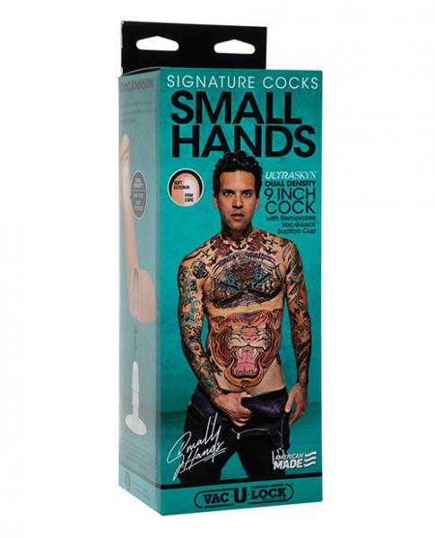 Signature Cocks Small Hands 9 inches Ultraskyn Cock from Doc Johnson Novelties. Signature Cocks Replica Dildo with Removable Vac-U-Lock Suction Cup. Small Hands, the tattooed porn star famous for more than one of his measurements, offers you a thick 9 inches with a Signature Cock molded directly from his most appreciated asset. Hand crafted in dual density Ultraskyn, this exclusive replica cock perfectly captures every detail, mimics the unique feel of real skin, and warms to body temperature with use. Make your porn star fantasy come true tonight! <br /><br />Features: soft exterior and firm core. Incredibly life like look and feel. Textured veins for added stimulation. Removable Vac-U-Lock Suction Cup for hands free play. Vac-U-Lock and O-Ring Harness compatible. Includes bag for discreet travel and storage. Phthalate free, body safe. <br /><br />Specifications total length 9.25 inches. Insertable, usable length 7.5 inches. Width, diameter 1.5 inches. Circumference 5.5 inches. Proudly made in America.