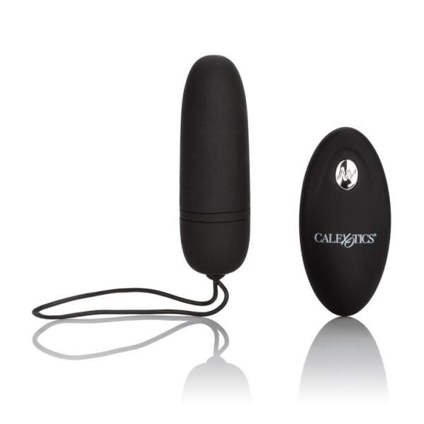Compact and discreet remote control use alone or with a partner! 12 intense functions of vibration, pulsation and escalation. Easy retrieval cord. Instructions included. Easy to use push button control. Hold for 3 seconds to turn off. Extended range 32.75 feet/10 meters range. Waterproof stimulator. Materials Silicone stimulator, retrieval cord, ABS plastic with polyurethane PU Cote controller, cap, ABS plastic with Silver Plating button. Measures 3.5 inches by 1 inch. Vibrator requires 2 AAA batteries. One for bullet and one for remote control. Not included. Sold separately. From CalEx.