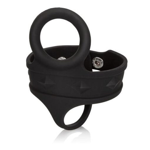 Stretchy and comfortable Silicone erection enhancer. Soft and smooth, thick and durable. Fully adjustable, three snap design. Heavy duty, nickel free hardware. Added scrotum strap for support and stamina. Testicular separation strap for enhanced stimulation. Materials Silicone enhancer, Nickel Free Iron rivets. Measurements 1.25 inches inner ring diameter, 8.5 inches by 1 inch. From CalExotics.