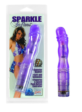 Dazzle your desires with the Sparkle Softees G! Jelly vibrator measures 6.75 sensual inches long. It has an 1 inch diameter and the shaft is not only ribbed, but also curved to hit your G-spot! Vibe is superior quality and Phthalate free. This powerful lover has a 3 speed push button controller. You will need 2 AAA batteries, not included. Who knew you could get so much sparkle out of something so soft?