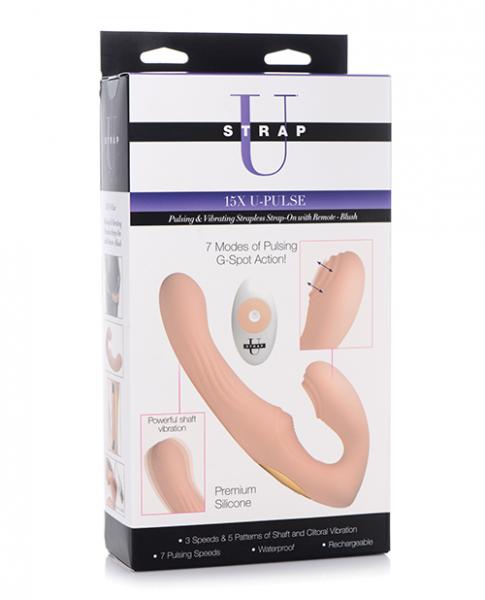 Indulge in incredible G-spot pulsing pleasure when you equip the U-Pulse – a double ended strapless strap on for couples who crave some penetration in their sex life! The defined swirled texture found on the shaft of this dildo adds a sultry texture to your thrusts, while the gently ribs on the clitoral pad stimulate the wearer with every movement.The U-Pulse strap-on is packed with features for a variety of sensations for both partners. The phallic shaft and ribbed clitoral pad feature 3 speeds and 5 patterns of vibration each, while the vaginal bulb features 7 intense g-spot pulsing patterns. Use all 3 functions independently or simultaneously – controls can be found on the base of the shaft, or you can utilize the included wireless remote controller for a more convenient play session!The U-Pulse is perfect for couples who enjoy strap-on play and pegging, but desire a toy to give their sessions an extra kick when needed. The combination of G-spot, clitoral, and shaft vibration give you and your partner a strap-on that can do it all!The U-Pulse is crafted to be waterproof, for ease of cleaningShaft Measurements: Overall length 9.2 inches, insertable length 5.4 inches, widest shaft diameter 1.4 inches, narrowest shaft diameter 1.2 inches.Vaginal Bulb Measurements: Insertable length 3.6, vaginal bulb width 1.7 inches.Materials: Silicone, ABS Plastic.