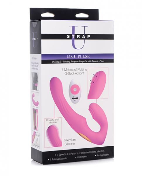 Indulge in incredible G-spot pulsing pleasure when you equip the U-Pulse – a double ended strapless strap on for couples who crave some penetration in their sex life! The defined swirled texture found on the shaft of this dildo adds a sultry texture to your thrusts, while the gently ribs on the clitoral pad stimulate the wearer with every movement.The U-Pulse strap-on is packed with features for a variety of sensations for both partners. The phallic shaft and ribbed clitoral pad feature 3 speeds and 5 patterns of vibration each, while the vaginal bulb features 7 intense g-spot pulsing patterns. Use all 3 functions independently or simultaneously – controls can be found on the base of the shaft, or you can utilize the included wireless remote controller for a more convenient play session!The U-Pulse is perfect for couples who enjoy strap-on play and pegging, but desire a toy to give their sessions an extra kick when needed. The combination of G-spot, clitoral, and shaft vibration give you and your partner a strap-on that can do it all!The U-Pulse is crafted to be waterproof, for ease of cleaningShaft Measurements: Overall length 9.2 inches, insertable length 5.4 inches, widest shaft diameter 1.4 inches, narrowest shaft diameter 1.2 inches.Vaginal Bulb Measurements: Insertable length 3.6, vaginal bulb width 1.7 inches.Materials: Silicone, ABS Plastic.