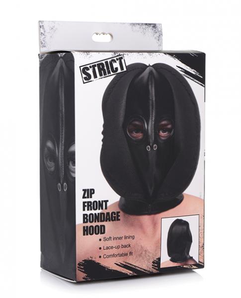 Darken the senses with this Zip Front Bondage Hood! This hood denies the senses and blinds your sub with ease, making it simple to engage in kinky objectification play. Featuring two eye holes and a pair of breathing holes in the inner hood so your partner can see whats coming, only for you to zip up the front to take away their vision.The inner hood is crafted to be breathable even with the outer hood zipped shut, while the lace-up back makes it easy to find the perfect fit for all head shapes and sizes. Deny you lovers sight without making them uncomfortable and transform them into an object for your pleasure!The inner lining is soft and flexible with an exterior made with lightweight PU leather for a comfortable fit and texture for stress-free extended sessions. Combine this hood with other Bondage accessories like wrist cuffs, spreader bars, and floggers for a genuine dungeon aesthetic and experience!Measurements: Overall length 13 inches, overall width 13.5 inches, neck circumference 18 inches.Materials: PU Leather, Metal (Nickel free).