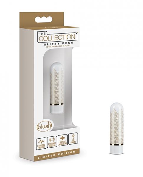 The Collection Glitzy Deco Bullet's strength will shine! Deco's Gold accents bring style to your playtime. Discover 10 powerful vibration functions packed inside Glitzy Deco's compact body. Discreet, simple to store, and a perfect travel companion! Glitzy Deco is rechargeable, body safe, splashproof, and easy to clean. SIZE- 2.5 Inch Length x 0.7 Inch Width.