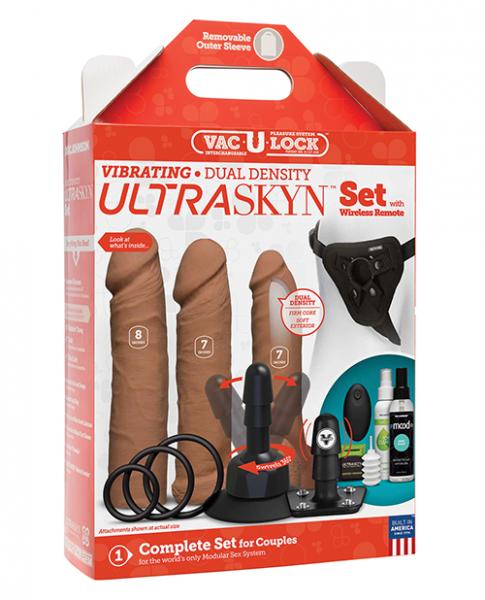 Your perfect strap-on experience is on lock with Doc Johnson's deluxe line of full-service Vac-U-Lock Deluxe Sets. The Vac-U-Lock Dual Density ULTRASKYN Set is a solid investment for upgrading or beginning your strap-on accessories collection, offering multiple options in one box via a complete harness with removable O-rings, a 7-function rechargeable vibrating Vac-U Plug with remote, three ULTRASKYN attachments, and a bottle of Mood water-based lube. These lifelike dual density attachments — an 8” Realistic Dong, a 7” Cock, and the bestselling 7” Slim Cock — warm to body temperature with use and feature a soft exterior that gives way to a firm inner core, recreating the feel of a real erect penis. Attachments can be used with the harness, the included 360° Swivel Suction Cup, or any other accessory or harness in the line. The Vac-U-Lock Dual Density Starter Set also includes Doc Johnson Natural Toy Cleaner and ULTRASKYN Refresh Powder to properly and hygienically maintain your dual density ULTRASKYN attachments. Every product in the patented Vac-U-Lock system is designed to help you create any strap-on or toy you're in the mood for, and it's as simple as popping on the attachment of your choice. Color: Caramel Material TPE/PP/Neoprene Total Length 8" Realistic Dong: 8.25 in. (21 cm) – 7" Cock: 7.25 in. (18.4 cm) – 7" Slim Cock: 7.25 in. (18.4 cm) Insertable/Usable Length 8" Realistic Dong: 8.25 in. (21 cm) – 7" Cock: 6.5 in. (16.5 cm) – 7" Slim Cock: 6.25 in. (15.9 cm) Width/Diameter 8" Realistic Dong: 1.75 in. (4.4 cm) – 7" Cock: 1.75 in. (4.4 cm) – 7" Slim Cock: 1.75 in. (4.4 cm) Circumference 8" Realistic Dong: 5.5 in. (14 cm) – 7" Cock: 5.5 in. (14 cm) – 7" Slim Cock: 5 in. (12.7 cm) Waist Size Adjustable Up to 69”