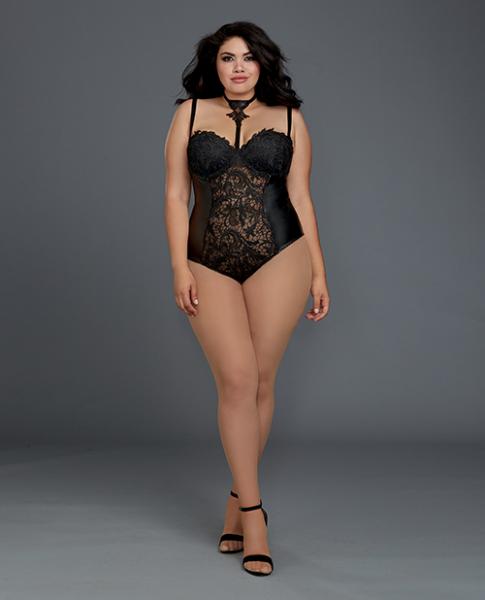 Venice Lace and Stretch Faux Leather Teddy with Snap Crotch from Dreamgirl international lingerie line. Ladies plus size, 3X. Cups DD. Bust 48 inches to 52 inches. Waist 40 inches to 42 inches. Hips 50 inches to 52 inches.