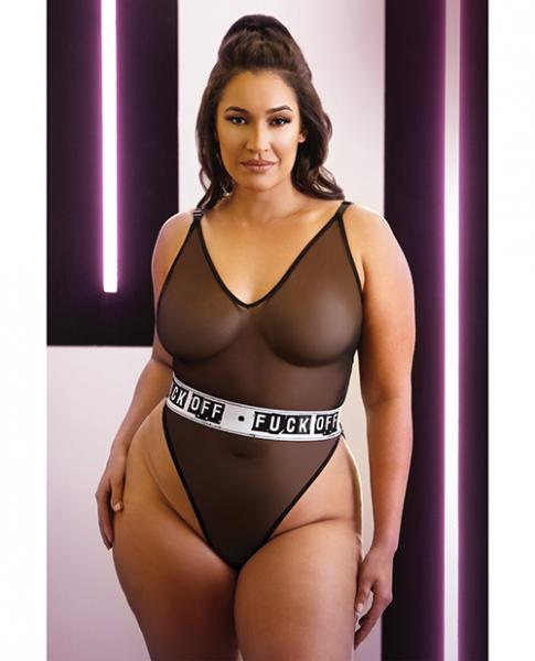 Cheeky Mesh Playsuit with "Fuck Off" Elastic Waistband.Materials: 95% Polyester, 5% Spandex.Washing Instructions: Hand wash separately in cold water. Do not bleach. Flat dry.Queen SizeCup: DD/DDDBust: 40"-42"Waist: 34"-38"Hips: 42"-44"
