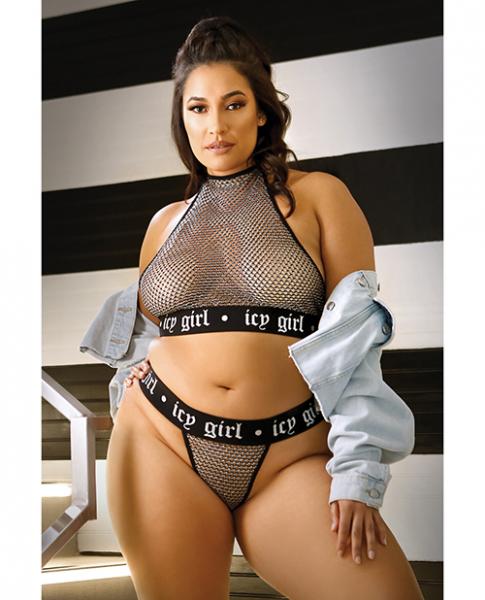 Metallic Fishnet Halter Top & Matching Panty with "Icy Girl" Elastic.Materials: 97% Polyester, 3% Silver Lurex. Washing Instructions: Hand wash separately in cold water. Do not bleach. Flat dry.Queen: Size: 14-18, Bust 42in.-46in., Hips: 42in. – 49in.