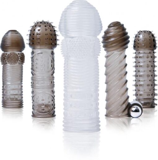 Adam and Eve customers love their penis sleeves so here is the tool kit you have been waiting for! For fun and variety created by 5 stretchy Thermoplastic Rubber TPR sleeves to add extra length and girth to your erection. Each 5 inches long by 1.5 inches wide sleeve has its own unique set of thrust loving textures to give her something special to remember you by. Add the mini vibe to special sleeve holsters for out of this world vibrations targeted for her hungry clitoris! From seductive swirls to fantastic kitty ticklers, pleasure nubs and scrubbers. Each unique sleeve has textures ready to tantalize, tease and massage her inner walls for the big climax.