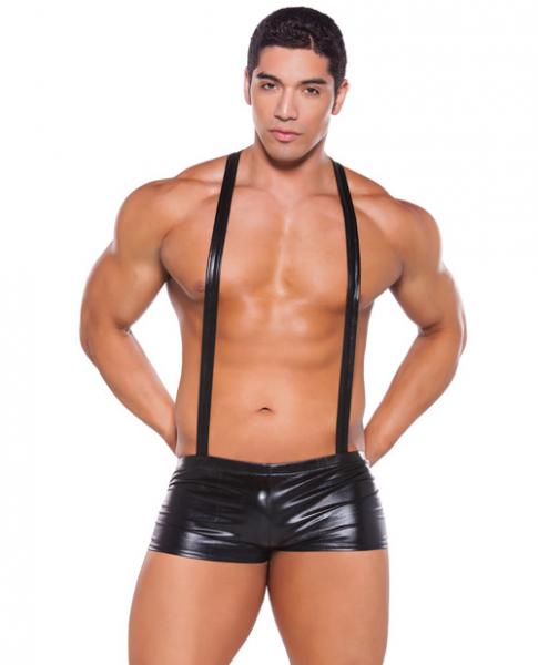 Wet Look Suspender Shorts Black O/S. Help make things playful with these snug and sexy wet look shorts with suspenders. Full wet look back. One size fits most.